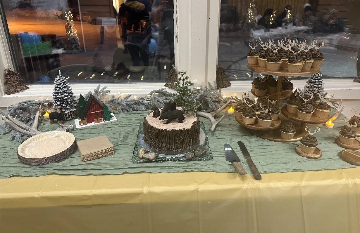 Decor: Pine trees, moss, wooden elements, and animal figurines like foxes, deer, and bears.